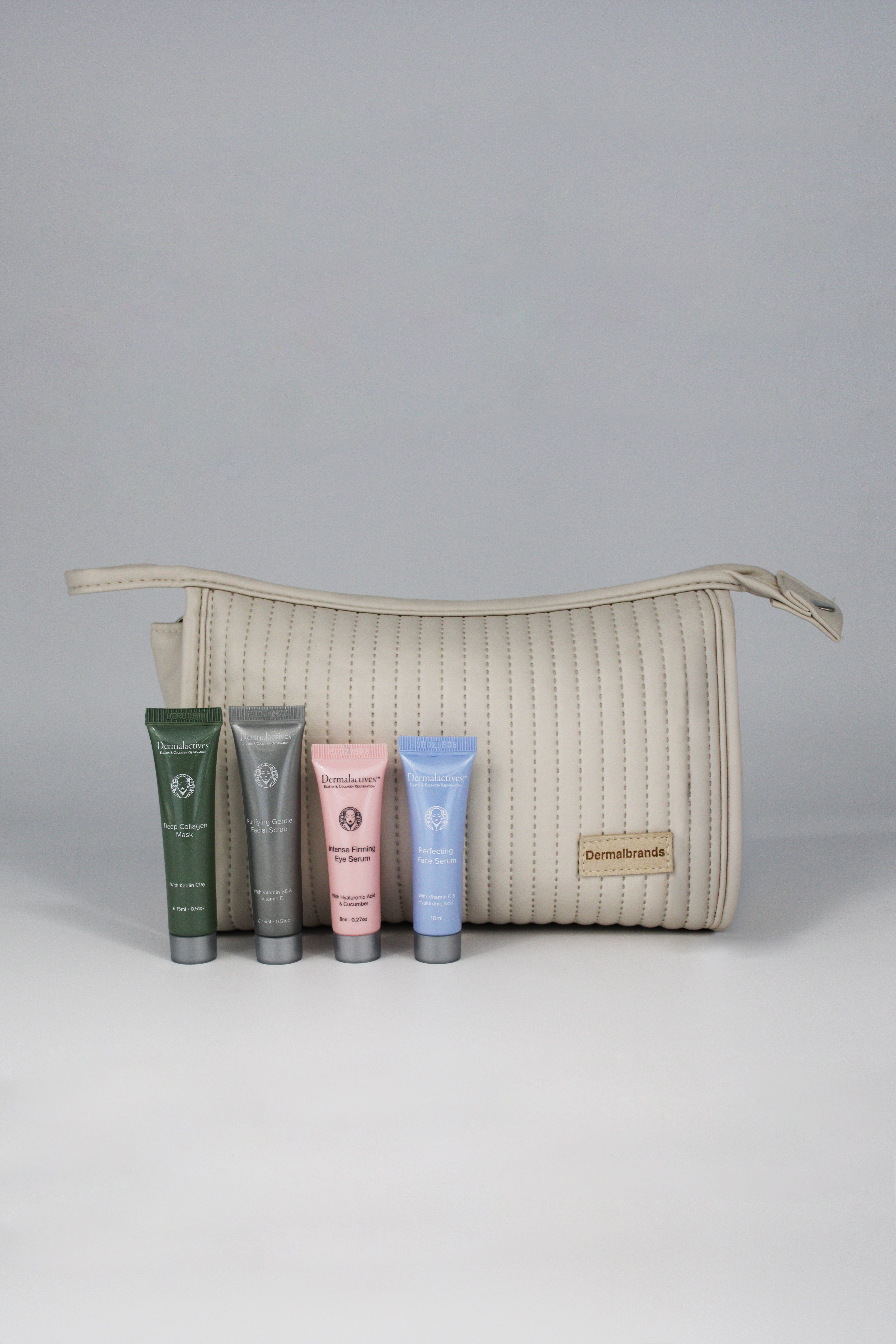 The Dermalactives Travel Skin Essentials set includes three best-selling mini skincare products plus a travel bag. Designed to exfoliate, brighten, hydrate, and firm the skin, this TSA-friendly bundle delivers visible results wherever you go.